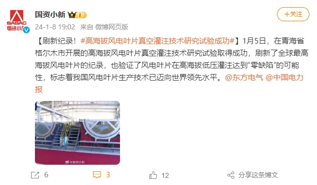 【刷新纪录!#高海拔风电叶片真空灌注技术研究试验成功#】1月5日,在青海省格尔木市开展的高海拔风电叶片真空灌注技术研究试验取得成功,刷新了全球最高海拔风电叶片的纪录,也验证了风电叶片在高海拔低压灌注达到“零缺陷”的可能性,标志着我国风电叶片生产技术已迈向世界领先水平。@人生就是搏@中国电力报